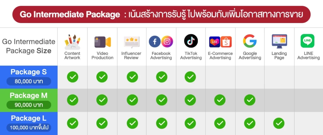 *หมายเหตุ* ตารางนี้เป็นเพียงช่องทางที่ Go Online แนะนำสำหรับแต่ละแพ็กเกจเท่านั้น ลูกค้าสามารถปรับเปลี่ยนได้ตามความเหมาะสม และสามารถเลือกเฉพาะช่องทางที่ลูกค้าสนใจได้